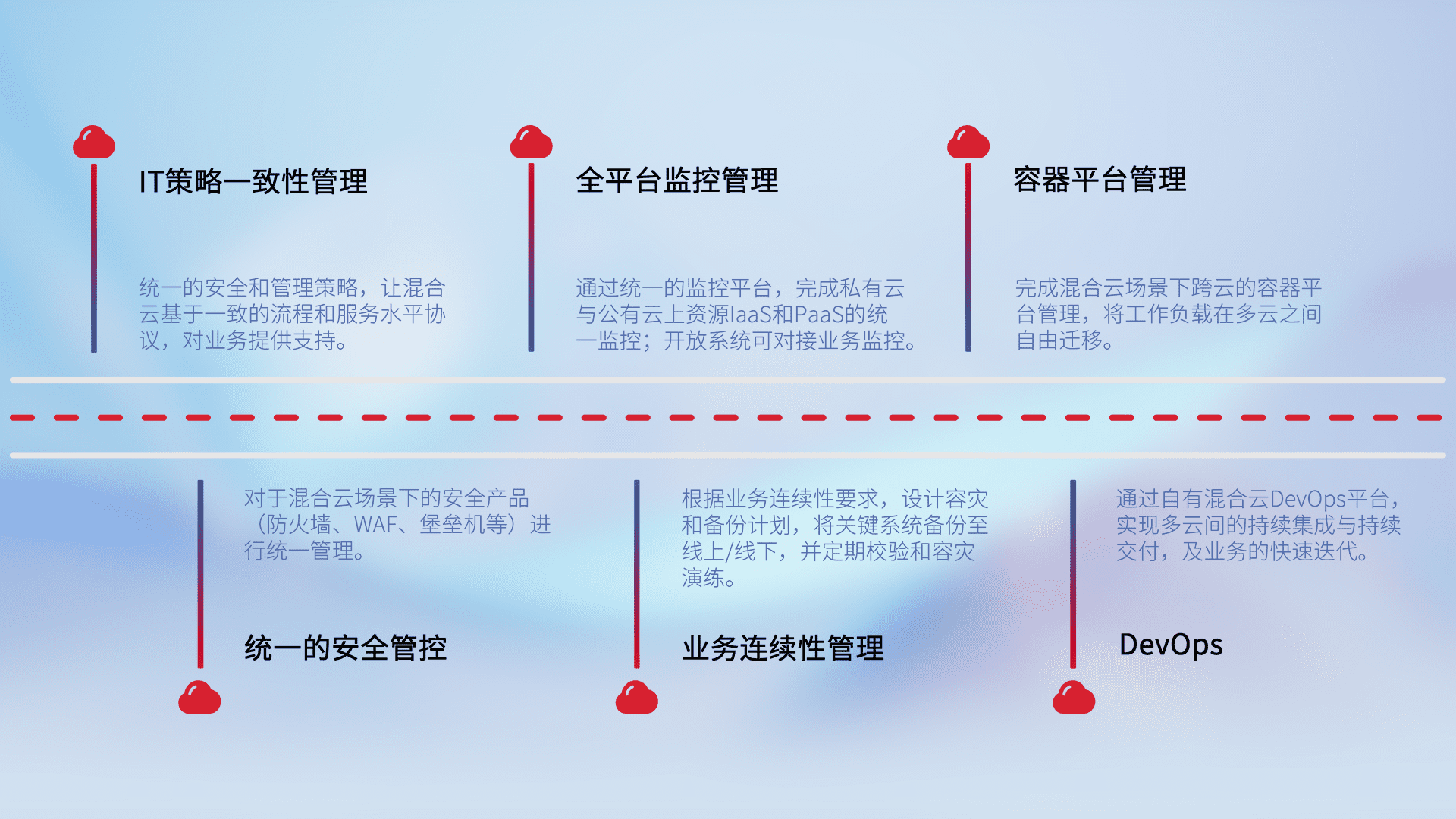 通过多云纳管,,,以统一的资源数据模型把客户的云资源进行抽象和封装,,,进而实现对多云资源的统一操作,,保障云资源管理的可靠性、、稳定性与可用性。。。量身定制化运维内容,,配置、、开发运维、、、补丁管理、、备份、、、、监控、、认证和访问管理、、审计和日常巡检等,,,,保障在用云过程中的可靠度,,稳定度以及高可用率。。。